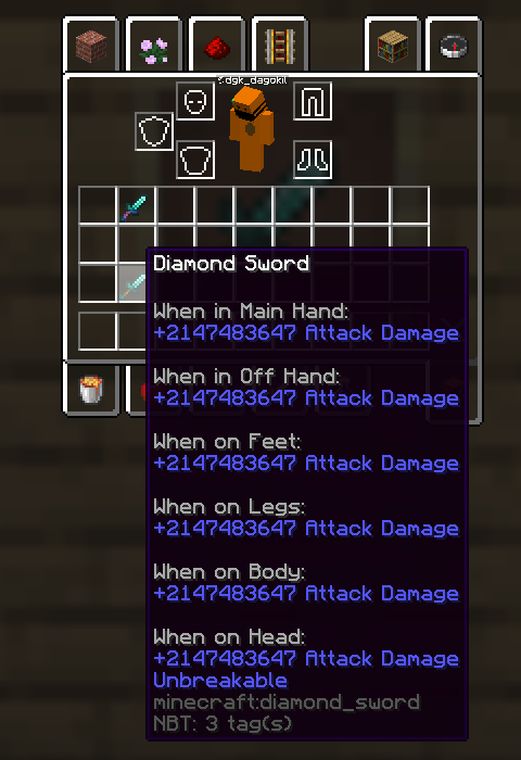 예) diamond_axe (다이아몬드도끼) , diamond_pickaxe (다이아몬드곡괭이) , diamond_chestplate (다이아몬드갑옷)